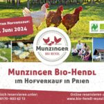 Die Möglichkeit, frische Naturland Bio-Hendl zu erwerben, ergibt sich am Freitag, 21. Juni 2024, beim nächsten Hofverkauf. Damit jeder die Bio-Hendl sicher bekommt, wird eine Reservierung empfohlen. Eine Vorbestellung ist unter der Telefonnummer 0170-8036213 oder auf der Website www.bio-hendl-munzinger.de möglich.