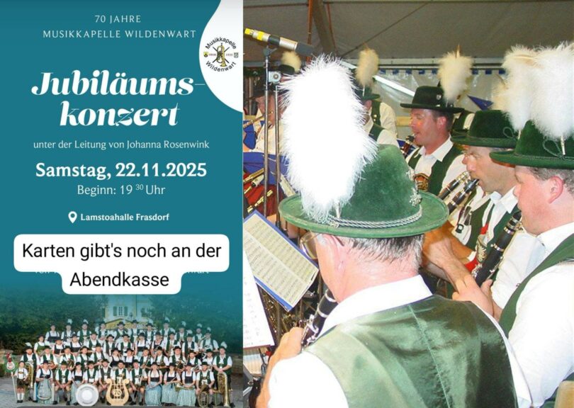 Am Samstag, 22. November lädt die Musikkapelle Wildenwart zu ihrem Herbst- und Jubiläumskonzert (70 Jahre) in die Frasdorfer Lamstoahalle ein. Konzertbeginn mit Johanna Rosenwink als Dirigentin ist um 20 Uhr. Bereits ab 19 Uhr spielen die Zwergerl- und die Jugendkapelle auf.