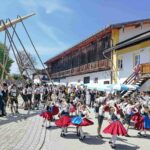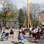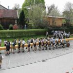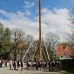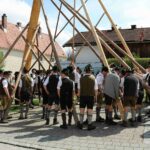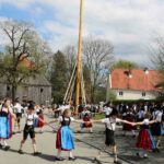 67 Männer der drei Trachtenvereine von Prien, Atzing und Wildenwart stellten den fast drei Tonnen schweren, 28 Meter langen Maibaum vor der Wildenwarter Schlosswirtschaft auf. Erstmals in der Wildenwarter Maibaumgeschichte wurde der neue Maibaum unmittelbar nach dem Fällen in der Deutenau von den beiden Nachbarsvereinen aus Prien und Atzing miteinander „sichergestellt“. Gestiftet wurde der Baum vom Wildenwarter Schlossherrn Herzog Max in Bayern. Die nächsten fünf Jahre wird er im Mittelpunkt des Wildenwarter Dorflebens stehen. Über zwei Stunden harte Arbeit unter der Leitung von Georg Aicher, war notwendig, um den Baumriesen an seinem Platz an der Südseite der Schlosswirtschaft fest zu verankern. Mit Musik, Ross und Wagen, wie es der Brauch verlangt, brachten die beiden Vereine aus der Nachbarschaft den Baum zum Aufstellen nach Wildenwart zurück. Dank des Kaiserwetters gingen die Verhandlungen bei strahlend blauem Himmel zwischen den drei Trachtenvorständen mit Hilfe des Frasdorfer Bürgermeisters Daniel Mair rasch und erfolgreich zu Ende: für eine Maß Bier und eine Brotzeit nach dem Aufstellen und ein paar Maß Wachterbier waren die Atzinger und die Priener bereit, den Baum wieder herzugeben und beim Aufstellen mitzuhelfen. Seit sie den Baum zu Weihnachten miteinander sichergestellt hatten, passten sie auf den Baum auf und bewahrten ihn treulich vor weiteren Diebstählen. Nach getaner Arbeit ließen sich die Aufsteller aus Atzing, Prien und Wildenwart gemeinsam das hart verdiente Bier und die Brotzeit schmecken. Mit ihnen feierten auch die vielen Besucher aus der ganzen Region und freuten sich an den Tänzen der Kindergruppe der Lustigen Wildenwarter.