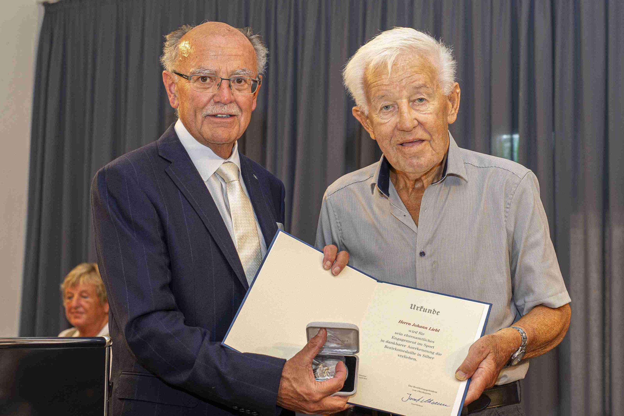 Bezirkstagspräsident Josef Mederer (links) überreichte die Bezirksmedaille an Johann Liebl.
