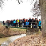 Foto für den Landkreis Traunstein: Bei Bergen stellt Gewässernachbarschafts-Berater Andreas Philipp den Teilnehmern die Entwicklung des Bergener Bachs vor. Ihn hat das Wasserwirtschaftsamt Traunstein bereits auf einem beispielhaften Streckenabschnitt umgestaltet, um die ökologische Struktur des Baches zu verbessern.