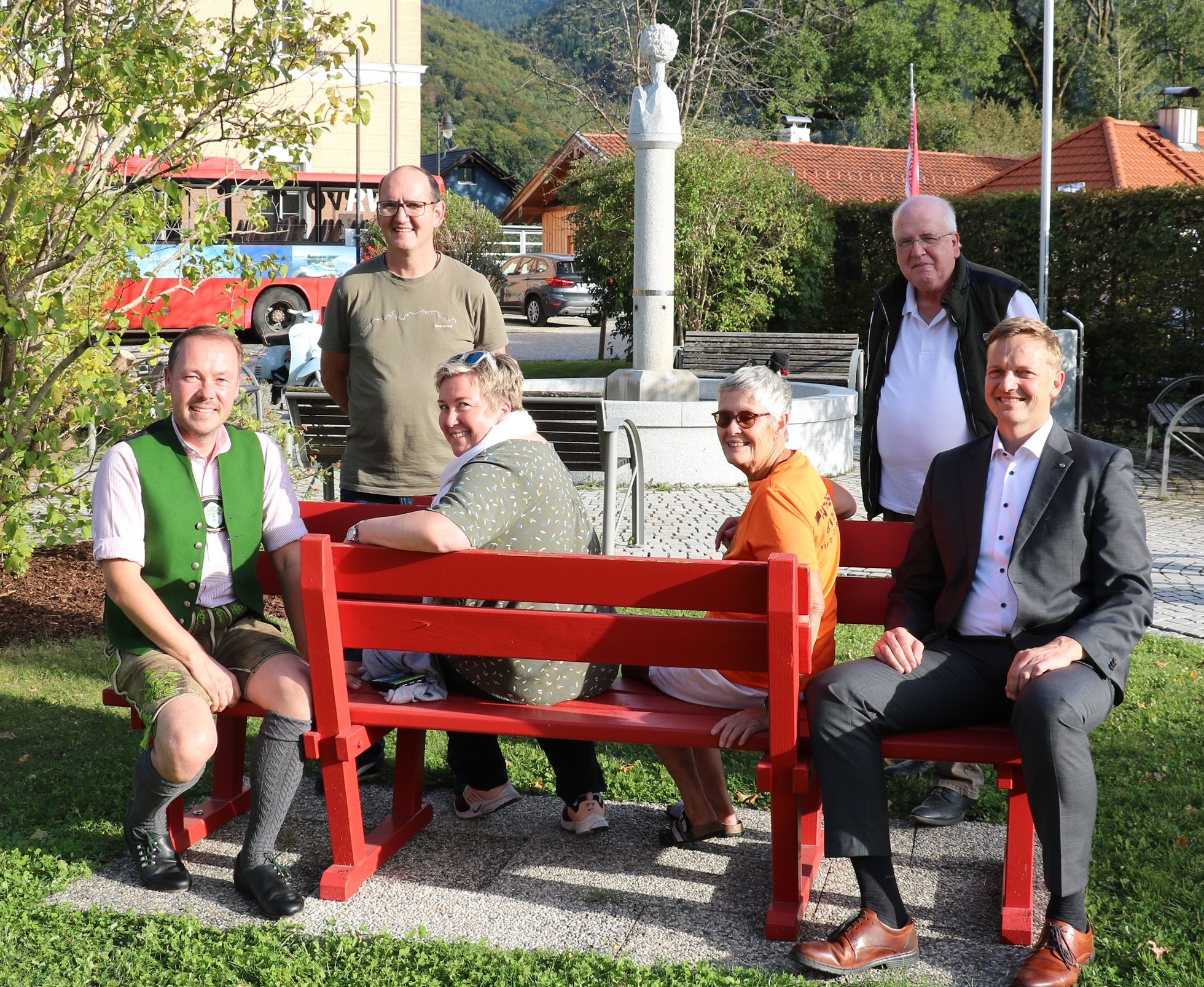 Es war dauernd etwas los beim „Zamhocka“ auf dem roten Ratschbankerl vor dem Aschauer Bahnhof. Bürgermeister Simon Frank (rechts) und Tourismus Chef Herbert Reiter (links) kamen zum letzten Ratsch zum Bankerl und eine ganze Stunde lang kamen die Leute aus Aschau und der Region um Neues zu erfahren, ihre Sorgen darzulegen oder auch nur um einmal dabei zu sein.
