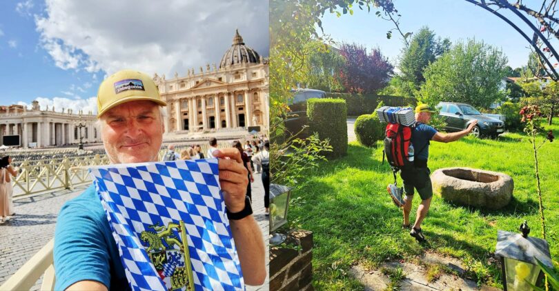 Bericht/Fotos: Tschali Wastl / Privat – Die Fotos zeigen den Breitbrunner Wolfgang Schlemer beim Start seiner Pilgerreise “Dahoam” in Breitbrunn (rechts) und der Ankunft sichtlich zufrieden im knapp 1000 Kilometer entfernten italienischen Rom am Petersplatz (links).
