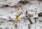 Gebirgsstelze erbeutet im Sprung an Stängeln sitzende Fliegen