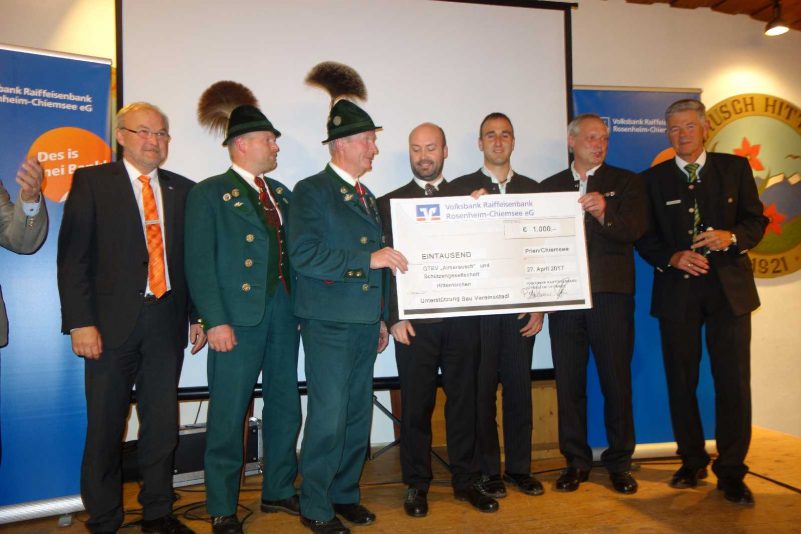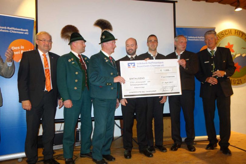 Mit einem Spendenbetrag von 1.000 Euro unterstützt die Volksbank Raiffeisenbank Rosenheim-Chiemsee eG den Trachtenverein und den Schützenverein von Hittenkirchen. Gemeinsam sind sie derzeit dabei einen Vereinsstadel zur Unterbringung des Vereinsinventars fertig zu stellen. Die Übergabe der Spende erfolgte bei der Mitglieder- und Kundenversammlung der Volksbank Raiffeisenbank in Prien im Trachtenheim von Hittenkirchen. Unsere Aufnahme zeigt von links: Peter Fitzner (stv. Geschäftsführer der VR Bank Prien), die Trachtenvorstände Florian Wörndl und Christoph Kaufmann, vom Schützenverein Christian Schuster, Franz Thalhammer und Alfred Angerer sowie Geschäftsführer Peter Holzner von der VR Bank Prien.