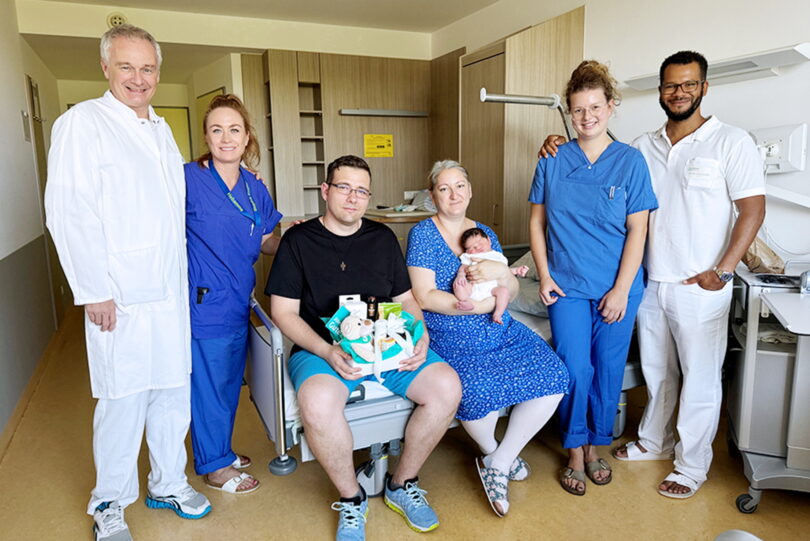 Bericht und Foto: RoMed Kliniken – Den ersten offiziellen Fototermin hat das Jubiläumsbaby verschlafen! V.l.n.r.: Chefarzt PD Dr. Andreas Schnelzer, Hebamme Stephanie Knogler, Sergiu und Antoneta Ghita mit dem kleinen David, Hebammenstudentin Isabella Steer und Oberarzt Dr. Elo Obieromah