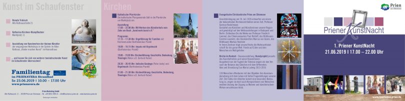Prien ist ein kulturverliebter Ort, in dem Kunst der Vergangenheit und der Gegenwart hautnah erlebt werden kann. Eine Möglichkeit dazu bietet die Priener Kunstnacht am Freitag, den 21. Juni 2019, bei der zahlreiche Kulturstätten von 17 bis 22 Uhr ihre Pforten der Allgemeinheit öffnen. Zudem wartet ein buntes Rahmenprogramm mit musikalischen Highlights auf der Bühne am Priener Marktplatz.