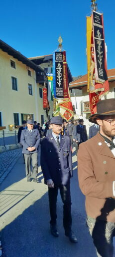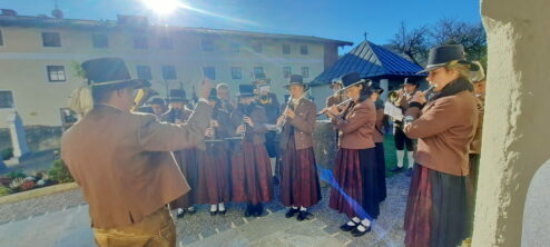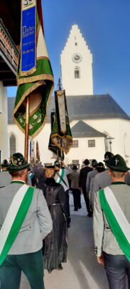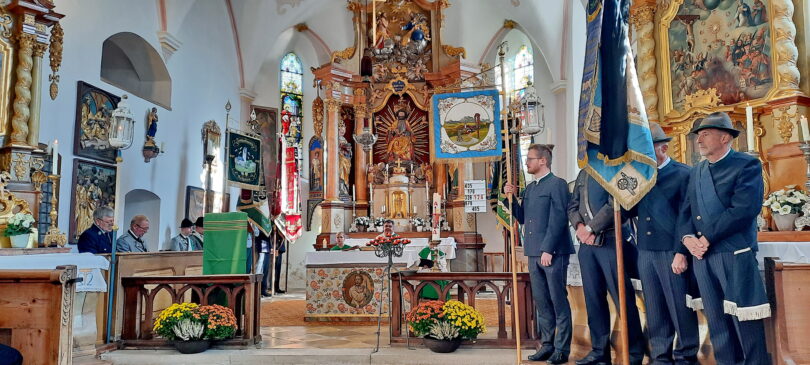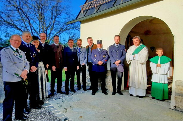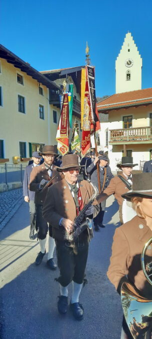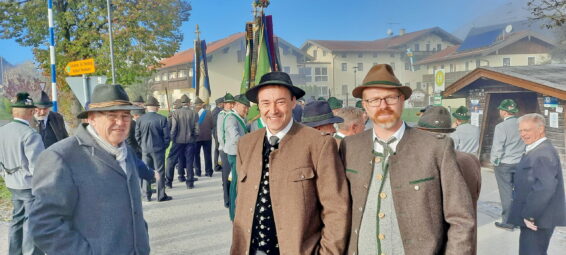 Umrahmt wurde der Gottesdienst, den Diakon Günter Schmitzberger in der Filialkirche St. Bartholomä feierlich zelebrierte, von der Musikkapelle Samerberg. Zum Abschluss wurde am Kriegerdenkmal ein Kranz der Gemeinde niedergelegt. Bürgermeister Georg Huber sagte: „Krieg und Gewalt sind leider allgegenwärtig, auch bei uns in Europa. Deshalb ist jeder von uns aufgefordert, seinen Teil beizutragen zu einer friedlichen Umgebung und zu einem friedlichen Miteinander in den Familien, im Freundeskreis, in der Arbeit und in den Vereinen.“ Diakon Günter Schmitzberger freute sich über den Zusammenhalt auf dem Samerberg und das gute Miteinander der Vereine, die auch immer bei kirchlichen Anlässen präsent sind. Bürgermeister Huber und Diakon Schmitzberger dankten den Vereinen für ihre ehrenamtliche Arbeit. Im Anschluss marschierte der Zug der Teilnehmer zum Badwirt zu einem gemütlichen Zusammensein.