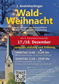 Die 1. Greimhartinger Waldweihnacht findet am Samstag, 17. Dezember von 14 Uhr bis 21  Uhr und am Sonntag, 4. Advent (18. Dezember) von 11 Uhr bis 19 Uhr statt. Veranstaltungsort ist im und am angrenzenden Wald zwischen Hörzing und Krinning.