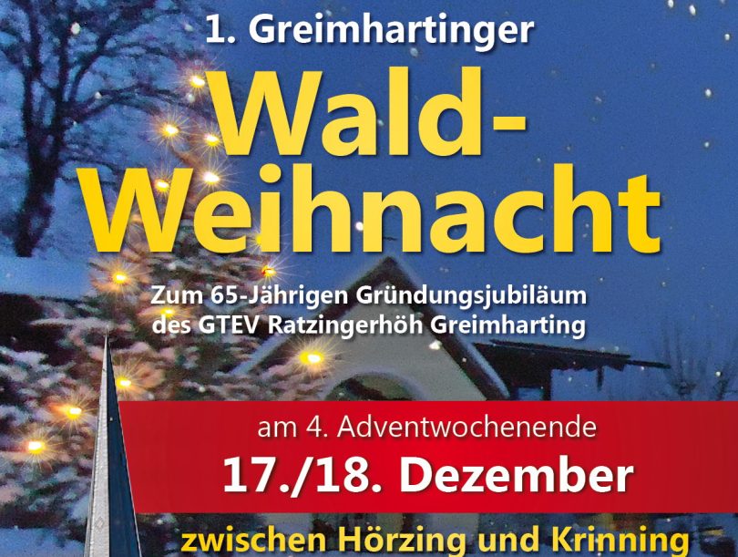 Anlässlich ihres 65-Jährigen Gründungsjubiläum veranstaltet der Trachtenverein “Ratzingerhöh” Greimharting am 4. Adventwochenende, 17. und 18. Dezember, erstmalig eine Waldweihnacht. Es handelt sich babei um eine kleine Ersatzveranstaltung für das 2022 in Greimharting vorgesehene Gautrachtenfest, welches aufgrund der Corona-Pandemie nach Schleching vergeben wurde.