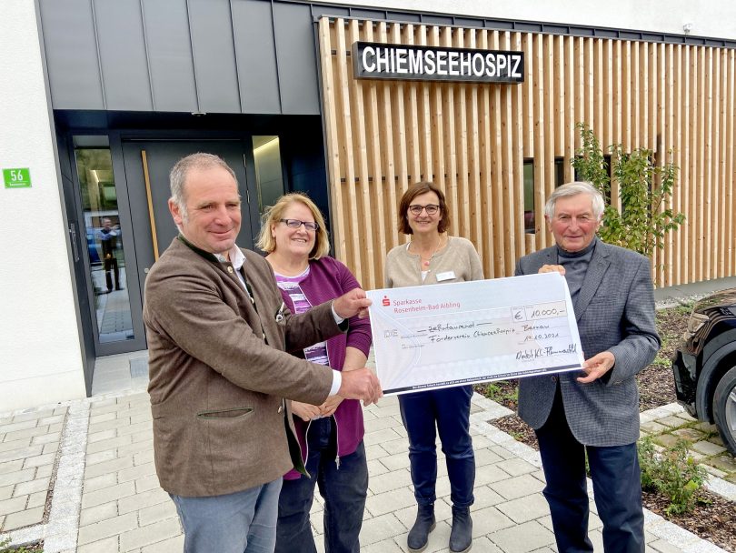 Foto: Hötzelsperger – 10.000 Euro Spende vom Hospizverein Rosenheim für das Chiemseehospiz von links: 1. Vorsitzender Norbert Kuhn-Flammensfeld, Barbara Noichl (Geschäftsstellenleiterin und Koordinatorin des Jakobus Hospizverein e.V. Rosenheim), Ruth Wiedemann (Leiterin Chiemseehospiz) und Fördervereins-Vorsitzender Alois Glück.