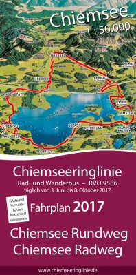 Das neue kostenlose Faltblatt – mit dem Fahrplan 2017, einer übersichtlichen Chiemsee-Regionskarte, mit den beiden Wegvarianten „Chiemsee Radweg“ (sportliche Radfahrer) und „Chiemsee Rundweg“ (Fußgänger und Genussradler), Einkehrmöglichkeiten entlang der Strecke und vielen weiteren Informationen – ist ab sofort bei den Tourist-Informationen der beteiligten Gemeinden und im Chiemsee-Alpenland Infocenter erhältlich oder bestellbar (Tel. 08051 96555-0; E-Mail: info@chiemsee-alpenland.de). Für Inhaber einer Kur- und Gästekarte der beteiligten Gemeinden – Aschau, Bad Endorf, Bernau, Breitbrunn, Chieming, Grabenstätt, Grassau, Gstadt, Prien, Rimsting, Seeon-Seebruck, Traunstein, Übersee – ist die Benutzung der Chiemseeringlinie sogar kostenfrei möglich.