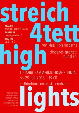 Ein 10 jähriges Bestehen der Kammermusiktage Inntal darf gefeiert werden und dies soll 2018 mit besonderen Highlights der Streichquartettliteratur geschehen. Die Kammermusiktage Inntal widmen sich fast ausschließlich der musikalischen Gattung des Streichquartetts, der Königsdisziplin der Kammermusik. Das Eröffnungskonzert der Kammermusiktage ist über die Grenzen des Landkreises hinaus nicht zuletzt wegen seines Charmes und seines eigenen Flairs längst kein Geheimtipp mehr und das nicht nur bei Insidern und Musikliebhabern.