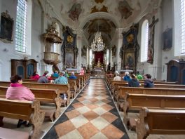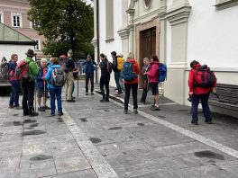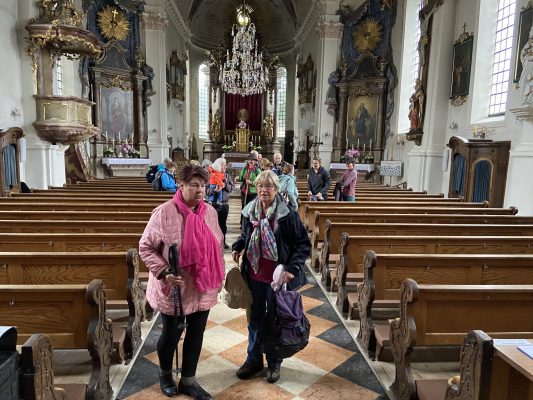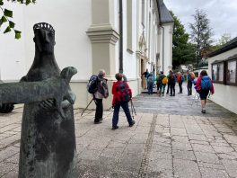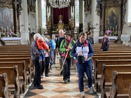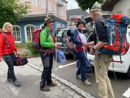 Das inzwischen 10. Pfingstpilgern des Pfarrverbandes Westliches Chiemseeufer hat mit ersten Gedanken, Gebeten und Liedern unter der Leitung von Pilgerwegsbegleiterin Monika Freund und mit Streckenführer Sepp Friedrich in der Pfarrkirche „Mariä Himmelfahrt“ in Prien begonnen. Heuer sind nur zwei ganze Wander- und Besinnungstage vorgesehen. Die erste Etappe nach einer Bahnanreise in den Rupertiwinkl, Ziel ist Bad Reichenhall-Ulrichshögel. Unsere Bilder entstanden beim Zusammentreffen vor der Kirche und bei der ersten Besinnung in der Priener Kirche.