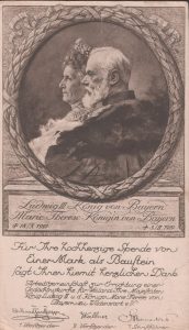 Beitragsbescheinigung für den Bau der Gedächtniskirche in Wildenwart nach dem offiziellen Porträt von Walter Firle zur Goldenen Hochzeit 1918. Diese Bauaktie und viele Postkarten mit dem Königspaar, der Überführung von Wildenwart nach Prien und dem Begräbnis in München sind noch in vielen alten Wildenwarter Häusern vorhanden.