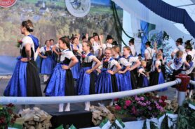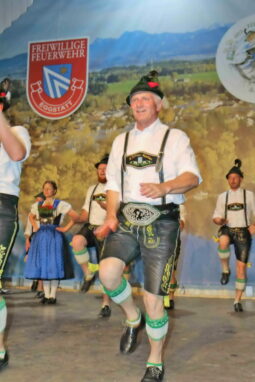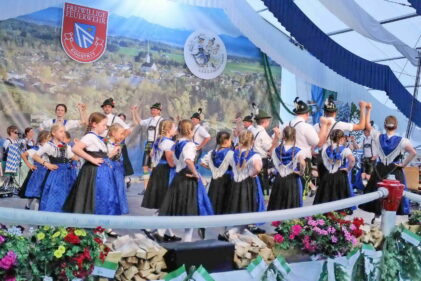 Das Programm nach dem Auftanz der Trachtenjugend und den ersten Weisen der Festmusikkapelle Prien erläuterte Ansager Lenz Berger, gestaltet wurde das Programm von den verschiedenen Trachtengruppen des Vereins, unter anderem mit Stern- und Kronentanz, vom Gesangs-Duo Hierl-Dicker, von der Hartsee-Musi, von den Rimstinger Sängern, von den vereinseigenen Goaßlschnalzern sowie von der Gaugruppe des Gauverbandes I. Dessen stellvertrender  Gauvorstand Florian Niedermayer gratulierte in seinem Grußwort dem Jubiläumsverein und dankte ihm für die saubere und ehrenamtliche Brauchtumspflege. In einem weiteren Grußwort würdigte Schirmherr Christian Glas die Leistungen der Eggstätter Trachtler in ihren ersten einhundert Jahren ihres Bestehens und dankte den vielen Helferinnen und Helfern aus den Reihen des Trachtenvereins, der Feuerwehr und den weiteren Ortsvereinen, die die derzeitigen Festzelttage vorbereitet haben und nunmehr auch zu einem echten Gemeinde-Fest werden lassen. Den Abschluss des Bühnenprogrammes bildete mit dem „Gauschlag“ ein Gemeinschaftsplattler, der die Verbundenheit der Eggstätter Trachtler mit den Paten- und Nachbarsvereinen zum Ausdruck brachte.