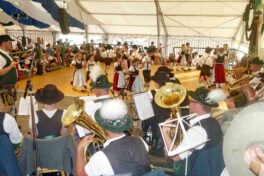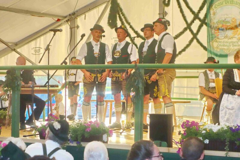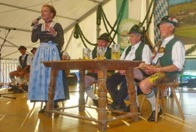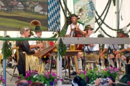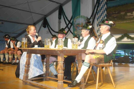 Zum ersten Bühnenabschnitt spielten die seit 20 Jahren bestehende Holzanger-Musi und die ebenfalls heimische Westenbach-Musi auf, für den Gesang sorgten die Rimstinger Sänger. Deren Entstehung und Entwicklung war auch Bestandteil des Gesprächs der Moderatorin Regina Wallner mit Schorsch Heindl, Konrad Feichtner und Alois Frank. Die beiden Letzteren gehörten auch den ersten Rimstinger Sängern an, deren Nachfolger widmeten ihnen eine Wiederbelebung einer Aufnahme aus dem Jahr 1982 vom Gasthof Strasser mit dem Lied „Hab a Dinai wia Milli und Bluat“ mitsamt einem raren Jodler. Der Rückblick in die Chronik beinhaltete auch die Bezahlung der ersten Vereinsfahne in Inflationszeiten, als nach der Abgabe von Geldscheinen in zwei Rücksäcken für die Überbringer nur noch Geld für Semmeln als Brotzeit übrigblieb. Plattlerproben mit damals verbundenen Kraft- und Geschicklichkeitsspielen, Seefeste –unter anderem beim ersten 1969 mit Bier-Defiziten- sowie 55malige Vereinsausflüge waren weitere Themen und Teil des Dialogs auf der Bühne und machten neugierig auf die Festschrift.