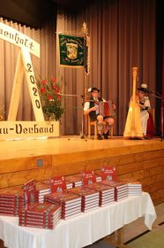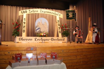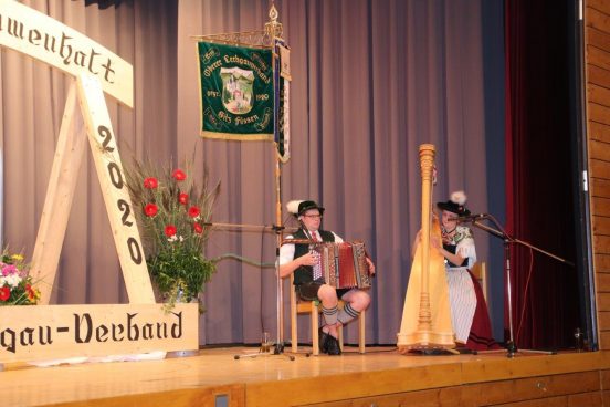 Was war anlässlich 100 Jahre Oberer Lechgau-Verband doch alles geplant! Die Vorstellung der Chronik sollte bereits am 27. April stattfinden und gleich in der Woche darauf der große Festabend. Lediglich Ersteres wurde unter Einhaltung der Hygieneregeln am letzten Juli-Samstag, dem Termin für den Gauheimatabend, abgehalten. Ein Abend für „Blick in den Oberen Lechgau“ in der Auenhalle in Hopferau. Musikalisch wurde dieser Abend gestaltet von Moritz und Vreni mit Ziach und Harfe, die zwischen den Ansprachen ihre Musikstücke präsentierten und anschließend zur Unterhaltung fleißig aufspielten.