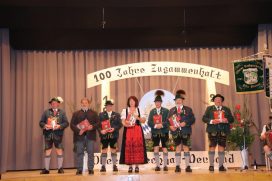 Zur Vorstellung der Chronik konnte 1. Gauvorstand Walter Sirch den Ehrenvorstand des Gaues und Vorsitzenden des Bayerischen Trachtenverbandes Max Bertl, dessen Stellvertreter Günter Frey, die Landrätin des Landkreises Ostallgäu Maria Rita Zinnecker, den 1. Bürgermeister der Gemeinde Hopferau Rudolf Achatz, Konrad Vogel vom Chiemgau-Druck, den Buchausschuss mit Vorsitzendem Alfred Sieber, den Gauausschuss, Gauehrenmitglieder und die geladenen Vertreter der Vereine begrüßen. Die Ehrengäste gratulierten zur Chronik und zum 100. Geburtstag in ihren Ansprachen. Rudolf Achatz, 1. Bürgermeister der Gemeinde Hopferau wünschte allen einen netten Abend und erzählte ein paar Worte zur Geschichte über die Gemeinde Hopferau, mit dem ältesten Schloss im Landkreis Ostallgäu, dessen Ursprung bis ins Jahr 1468 zurückreicht. Die damaligen Schlossherren ließen dazu 1504 eine Schlosskapelle errichten, die heute noch als Pfarrkirche des Ortes besteht. Eine Chronik erfüllt eine wertvolle Aufgabe und sie stellt die Verbindung in die Vergangenheit her.