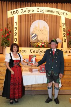 Umso wichtiger ist es die vergangenen 40 Jahre festzuhalten, das zeigt Wege mit viel Schaffenskraft im Oberen Lechgau-Verband und ist Verpflichtung und Wegweiser besonders für die jungen Trachtler in einem umfangreichen Nachschlagewerk. Aber genau so interessant und wichtig für alle anderen Trachtler und Leser, denen er dieses Buch ans Herz legt. Als Landrätin gratulierte Maria Rita Zinnecker vom Landkreises Ostallgäu dem Gau. Wer hätte gedacht, dass durch Corona so viele Dinge wegfallen, wie auch das Gaufest in Buching zum 100. mit Gauheimatabend und Festsonntag. Viele selbstverständliche Dinge sind z. Zt. nicht mehr möglich und auch nicht die Pflege von Kameradschaft und Traditionen. Wie selbstverständlich doch Dinge waren und jetzt werden von der Vorstellung Bilder mit Abstand gemacht. Kameradschaft und Traditionen werden seit 100 Jahren gepflegt, das spricht für die Zukunft und so ist diese Chronik ein Meisterwerk der lebendigen Gemeinschaft zum Weitergeben.