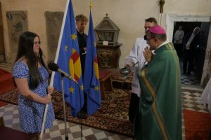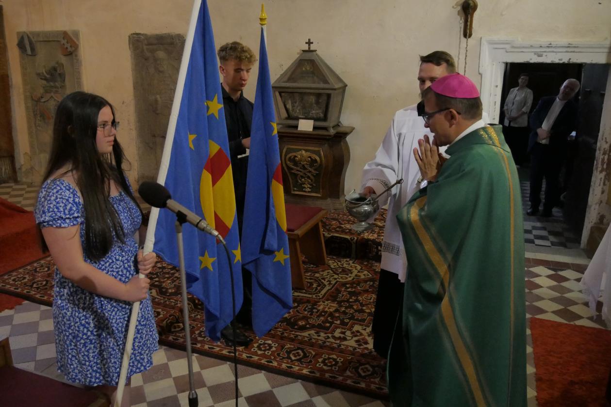 Bischof Tomas Holub von Pilsen weiht in der Ronsperger Kirche zwei Paneuropa-Fahnen, die Marlene Wolsky und Louis Kienle von der Paneuropa-Jugend nach Straßburg bringen werden. (Foto Stefan Zwinge)