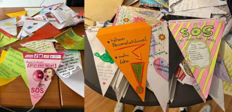 Auch nach dem offiziellen Einsendeschluss am 18.02. gehen weiter Wimpel ein und werden laufend ausgezählt. Erstmals lief die Aktion „Wimpel für Wandel“ von März bis Mai 2025. Aufgrund der großen Resonanz – aber auch angesichts der Enttäuschung in der Kita-Landschaft über die bisherigen Reformansätze beim Kinderbildungsgesetz (BayKiBiG) – wurde sie unter dem Motto „Jetzt erst recht“ von Oktober 2025 bis Februar 2026 fortgesetzt. Zu den zentralen Forderungen zählen eine nachhaltige Verbesserung der Finanzierungsgrundlage für Kitas, mehr Personal durch einen besseren Anstellungsschlüssel, eine höhere Fachkraftquote sowie eine qualitativ hochwertige Ausbildung für Quereinsteiger:innen. Zudem soll eine Regelung im BayKiBiG zurückgenommen werden, die es derzeit ermöglicht, Kita-Leitungen ohne pädagogische Ausbildung einzusetzen.