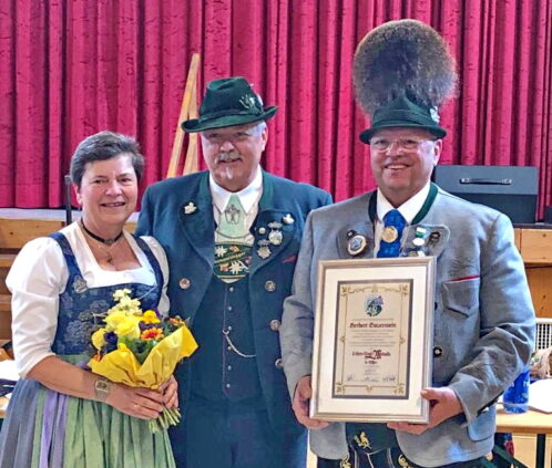 Zum Jubiläum 110 Jahre Rhein-Main-Gauverband 2024 stellte der Mitgliedsverein Alpenrose Heppenheim den Antrag, am 23. Juni 2024 das Gaufest des Rhein-Main-Gauverbandes ausrichten zu dürfen. Nachdem der 1. Gauvorstand Wolfgang Biereder den geplanten Ablauf erläutert hatte, stimmten die Delegierten einstimmig dem Antrag zu. Damit wird es nach längerer Zeit 2024 zum Gaujubiläum wieder ein Gaufest geben. Im Laufe der Versammlung wurde dann durch unseren Landesvorsitzenden Günter Frey eine besondere Ehrung vorgenommen: Herbert Sauerwein von Edelweiß Mainz- Weisenau wurde für seine Verdienste um Tracht und Brauchtum, u. a. 33 Jahre 1. Vorsitzender und 10 Jahre Kassier bei Edelweiß Mainz- Weisenau und 27 Jahre 2. Gauvorsitzender im Rhein-Main-Gauverband, mit der Lehrer Vogl Medaille in Silber ausgezeichnet. Wir gratulieren Herbert sehr herzlich zu dieser verdienten Ehrung. Ein besonderer Dank geht hier aber auch an seine Frau, Conny Sauerwein, für die Unterstützung. Der 1. Gauvorsitzende Wolfgang Biereder überreichte ihr als kleines Dankeschön einen bunten Blumenstrauß, sowie eine Flasche Sekt.