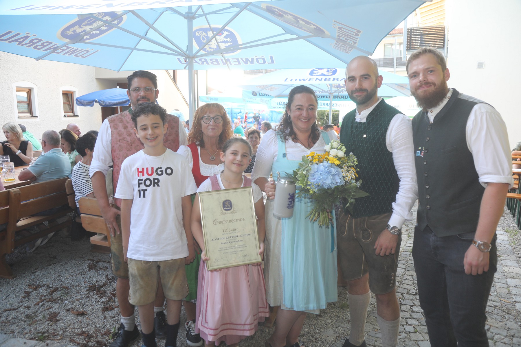 111 Jahre Zusammenarbeit mit der Brauerei Löwenbräu von links: Peter Walter (Gebietsverkaufsleiter), Sohn Markus, Seniorwirtin Christl Kuttenlochner, Tochter Christina, Wirtin Andrea Kuttenlochner, Dominik Netter (Vertriebsleiter) zusammen mit Frederic Berft (Qualitätsmanager)