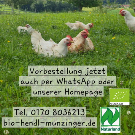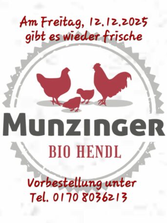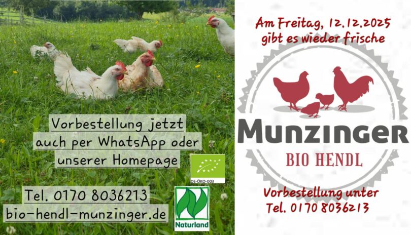 Am Freitag, 12. Dezember gibt es wieder frische Bio-Hendl vom Munzingerhof in Prien-Munzing.