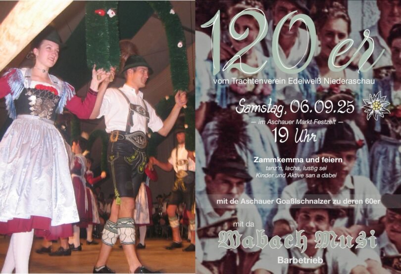 Der Trachtenverein Edelweiß Niederaschau wird heuer 120 Jahre jung – und dieses besondere Jubiläum wollen wir mit allen feiern: zünftig, herzlich, gmiatlich, so wie’s bei uns der Brauch ist.