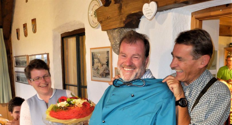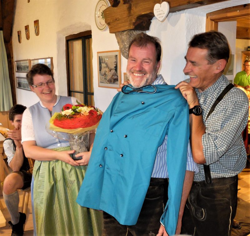 Oberaudorf/Kiefersfelden: Schon am Vorabend lud die Sektionsvorstandschaft des Rosenheimer Alpenvereins zur Vereinsfeier und so mancher „Ehemalige“ trug mit Geschichten in und um das Brünnsteinhaus zur Unterhaltung bei. Franz Knarr, Vorsitzender der Sektion, begrüßte dazu unter anderen die ehemaligen Hüttenreferenten Hans Berger und Gig Schmitt, die jahrelang in ehrenamt-licher Arbeit so einige Sanierungen und Modernisierungen mit bewältigten, denn auch in der Vergangenheit des stattlichen Berghauses stand die Zeit nie still. Die anl. des Jubiläums verfasste Chronik von Dieter Vögele gibt intensiven Aufschluss über all die bewegten Jahre. (Für Mitglieder kostenlos in der Geschäftsstelle erhältlich). Im Laufe des fröhlichen Abends motivierte Franz Knarr die Wirtsleute Yvonne und Sepp Tremml sowie die aktuellen Hüttenreferenten Schorsch Kurz und Erwin Resch mit Blumen und Arbeitskitteln (sh. Foto 3640 v.li. Yvonne und Sepp Tremml, Franz Knarr), will er sich doch auch in Zukunft auf die geschätzte Mitarbeit verlassen.