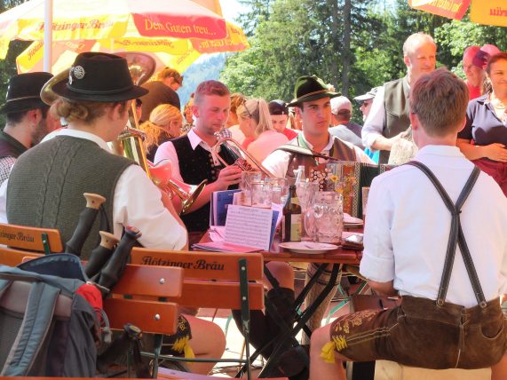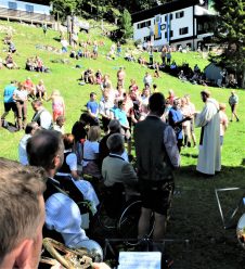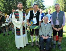 Am Morgen zum Jubiläumssonntag weckte ein wolkenloser Bergsommer die Gäste und schon bald trafen auch die ersten Bergwanderer ein. Zur Bergmesse versammelten sich viele Besucher auf der Wiese unterhalb des Brünnsteinhauses (sh. Foto 3709) und erlebten eine kurzweilige Messfeier, musikalisch umrahmt von einer einheimischen Bläsergruppe und aufrichtig zelebriert von Pater Matthäus aus dem Kloster Reisach. Die Vertreter der Gemeinde Oberaudorf mit zweitem Bürgermeister Alois Holzmaier und der Gemeinde Kiefersfelden mit Bürgmeister Hajo Gruber gratulierten herzlich und überreichten Erinnerungspräsente (sh. Foto 3724, v.li. Pater Matthäus, Franz Knarr, Kiefersfeldens BM Hajo Gruber und Alois Holzmaier, 2. BM Oberaudorf ). Dann füllte sich der Biergarten und die gute Organisation zur Versorgung mit Speisen und Getränken aus Küche und Keller sorgte für beste Stimmung. Bis zum frühen Abend hörte man nur fröhliche Stimmen, musikalisch pfiffig von jungen Musikanten unterhalten (sh. Foto 3727). (fxk)