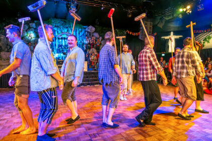 Und dann diese Szene, die man so schnell nicht vergisst: ein Pirat, erhöht auf einem rollenden Podest – auf einem großen Schwimmreifen – und er hält den Säbel in die Luft, während ringsum Handys hochgehen. Das ist genau diese Mischung aus Klamauk und Inszenierung, die den Abend trägt: Niemand tut so, als wäre das „ernst“. Aber alle nehmen es ernst genug, damit es funktioniert.