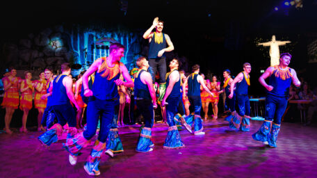 Im Hintergrund blitzt die Kulisse in Blau und Grün, wie ein nächtlicher Wasserfall im Scheinwerferlicht. Und irgendwo zwischen Lichtketten und Deko-Palmen steht diese Christus-Statue – still, fast surreal – als Kontrast zur Energie vorne.