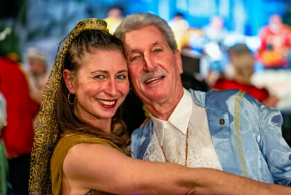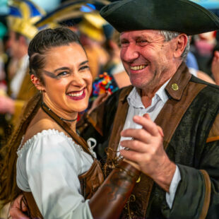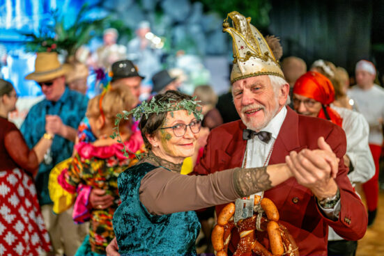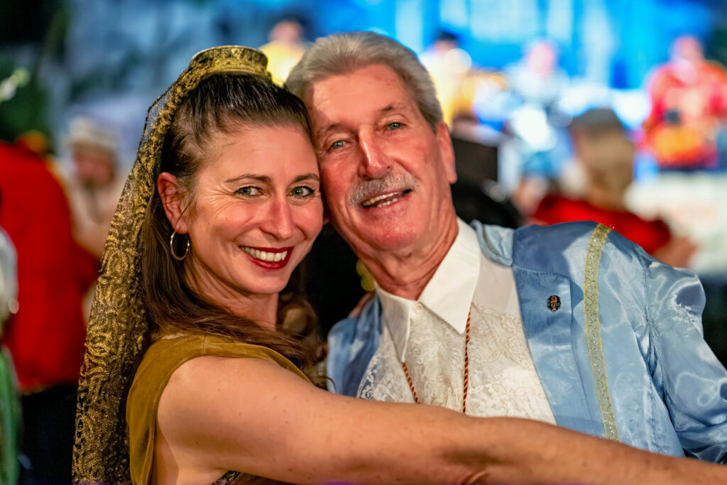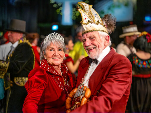 Kostüme, Charaktere, kleine Geschichten am Rand: Während vorn die Programmpunkte wechseln, schreibt der Saal nebenbei seine eigenen Geschichten. Da ist die elegant maskierte Dame im roten Tüll, halb geheimnisvoll, halb verschmitzt – ein Gesicht, das zeigt, warum Fasching auch Verwandlung ist. Da ist das Paar, das sich für ein Foto so eng zusammenzieht, als wäre es gerade erst angekommen – oder seit Jahrzehnten dabei. Da ist der Mann im roten Anzug mit Narrenkappe und einem Brezn-Kranz wie eine Ordenskette: ein Bild, das gleichzeitig Selbstironie und Tradition erzählt.