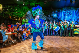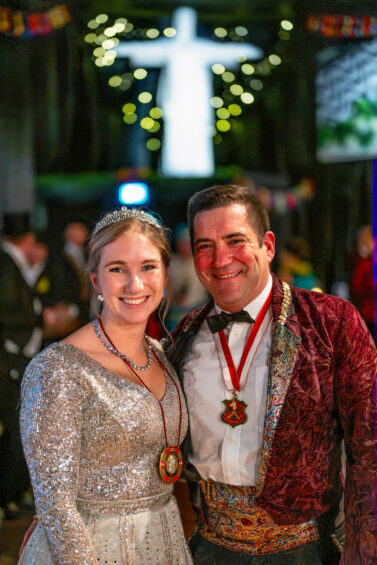 Schon beim Reinkommen ist klar: Das hier ist kein „Ball“ im braven Sinn. Die Halle ist verwandelt – üppiges Grün, Licht wie im Tropenhaus, und hinten über allem die weiß leuchtende Silhouette: eine Cristo-Redentor-Statue als Deko, passend zum brasilianischen Motto der Karnevalvereinigung. Es glitzert, es funkelt, es summt. Über den Tischen: Masken, Pailletten, Federboas. Über den Gesichtern: dieses spezielle Grinsen, das sagt: Heute darf alles ein bisschen mehr sein.