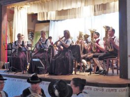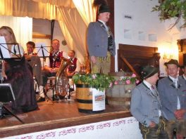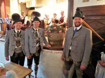Für den Jubiläumsverein gab es dabei reichliche Bier-Versprechungen: so überbrachte Vorstand Florian Niedermayer vom Patenverein Riedering (Gauverband I) ein symbolisches Fass Bier und versprach zur Nachfeier des Jubiläums mit 125 Liter Flötzinger-Bier und mit einem Spanferkel zu kommen. Martin Schober vom Samerberger Bruderverein Rossholzen versprach 50 Liter Bier und Marisa Steegmüller von der Flötzinger Brauerei Rosenheim sagte weiteres Freibier zu. Vorstand Sebastian Grad vom Trachtenverein Degerndorf (Bayerischer Inngau-Trachtenverband) überbrachte den Samern eine kulinarisch gut gefüllte Kraxe als Geschenk. Dazu sagte Vorstand Peter Sattlberger: „Diese Kraxe brachten wir schon mal zum Jubiläum nach Degerndorf und wir werden sie wieder bringen, wenn die Degerndorfer im Jahr 2026 ihrerseits das 125jährige Vereinsjubiläum haben“. Zu den weiteren Gratulanten gehörten  der stellvertretende Gauvorstand vom Gauverband I Michael Hauser (er vertrat den kurzfristig verhinderten Ersten Gauvorstand Peter Eicher) sowie Ludwig Redl vom Gebiet Simssee, dem die Grainbacher Trachtler angehören. Zur Unterhaltung spielte die Musikkapelle Samerberg unter der Leitung von Benedikt Paul auf, desweiteren erfolgten Einlagen von den Grainbacher Goaßlschnalzern und von Riederinger Ziachmusikanten. Ein Gemeinschaftsplattler rundete das gemütliche Zusammenkommen ab. „So ein Tag, wie wir ihn heute erleben durften mit Beieinander- und Fröhlichsein, das hat nach der langen Zeit der Einschränkungen gut getan“, so Zweiter Vorstand Michael Auer zum Tagesausklang. Abschließend wurde noch darauf hingewiesen, dass die bilderreiche Chronik des Vereins für die Zeit von 1896 bis 2016 weiterhin noch beim Verein sowie bei Schuh und Trachten Auer erhältlich ist.