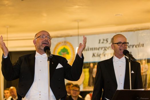 Ehrungen nahmen Benno Rummel, 1. Vorsitzender vom Innkreis Sängerbund und Alois Hundhammer, 1. Vorsitzender vom Sängerkreis Wendelstein vor, sie sagten: „Ein stattlicher Männerchor pflegt heute im Dienste einer echten Sängergemeinschaft die Chormusik, sei es das Volkslied sowie altes deutsches Liedgut. Damit hat sich der im weltlichen und kirchlichen Bereich, aber auch in der Zusammenarbeit im Sängerkreis mit großem Erfolg wirkende Jubelchor, um das Kulturleben von Kiefersfelden und darüber hinaus große Verdienste erworben“. Für besondere Verdienste gab es verschiedene Ehrungen, unter anderem für den 86jährigen Josef Meyer, der bereits 50 Jahre aktiver Sänger ist. Nach diesem ersten Teil des Festabends entrückten die Herren Wunderlich die Zuhörer in die zwanziger und dreissiger Jahre des vorigen Jahrhunderts. Mit meisterhafter Mimik und Gestik präsentierten sie u.a. Wochenend und Sonnenschein, Mein kleiner grüner Kaktus und meine Oma fährt Motorrad.