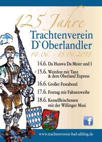 Der Trachtenverein D’Oberlandler Bad Aibling feiert vom 14. bis 18. Juni ihr 125-jähriges Gründungsjubiläum im Festzelt in Willing. Höhepunkt ist dabei der Festsonntag am 17. Juni mit Festgottesdienst und anschließenden Festzug. Näheres über alle Veranstaltungen und deren Ablauf können dem Programm im Anhang entnommen werden.