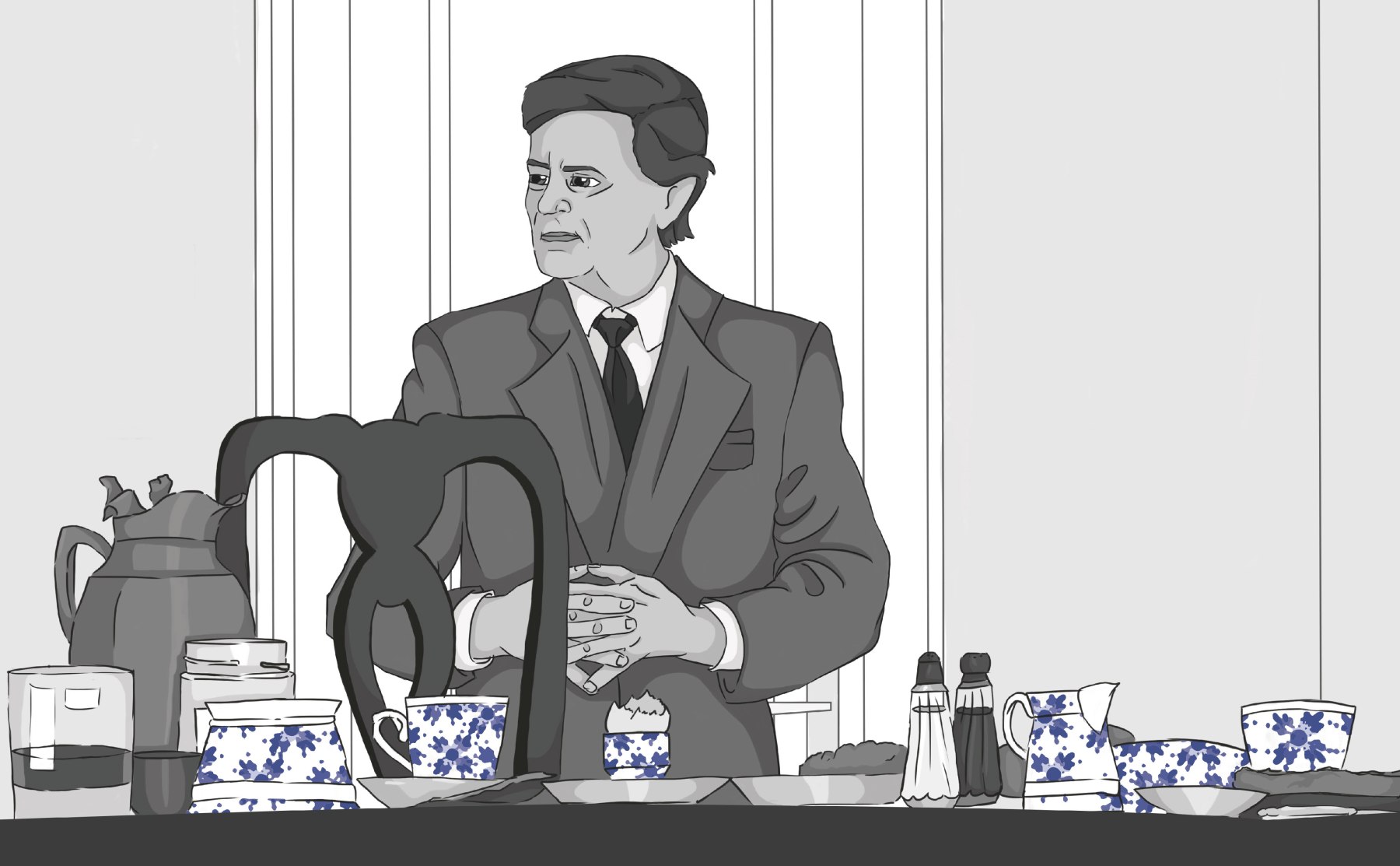 Eingangsszene aus Loriots „Pappa ante Portas“ (1991, © Rialto Film GmbH) Zeichner: Jennifer Rödel / Annika Linhardt / Leslie-Ann Röser / Jessica Sundermann / Sophia Bock. Grafik / Layout: Hannah Beer / Lea Wießmann / Marie Schaffer. © Porzellanikon