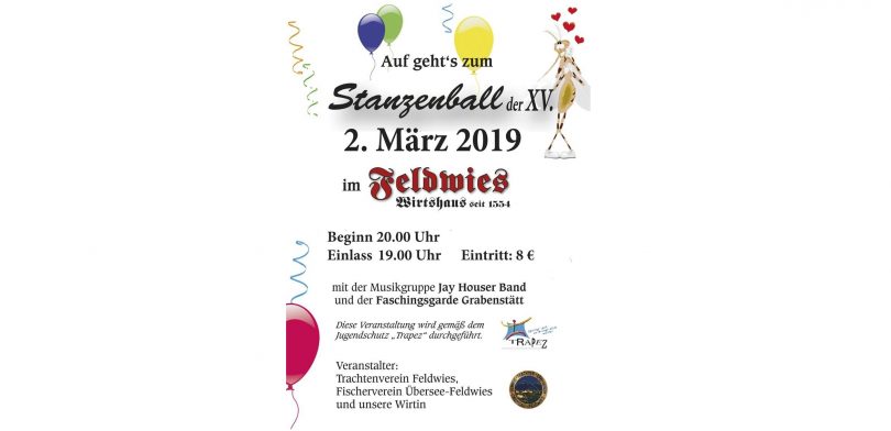 An diesem Samstag, den 2. März, findet im Wirtshaus d´Feldwies der legendäre Stanzenball statt. Für die richtige Stimmung sorgen die Jay Houser Band und die Faschingsgarde Grabenstätt. Der Trachtenverein Feldwies, der Fischerverein Übersee-Feldwies und die Wirtin Beate Stang freuen sich auf zahlreiche Besucher.