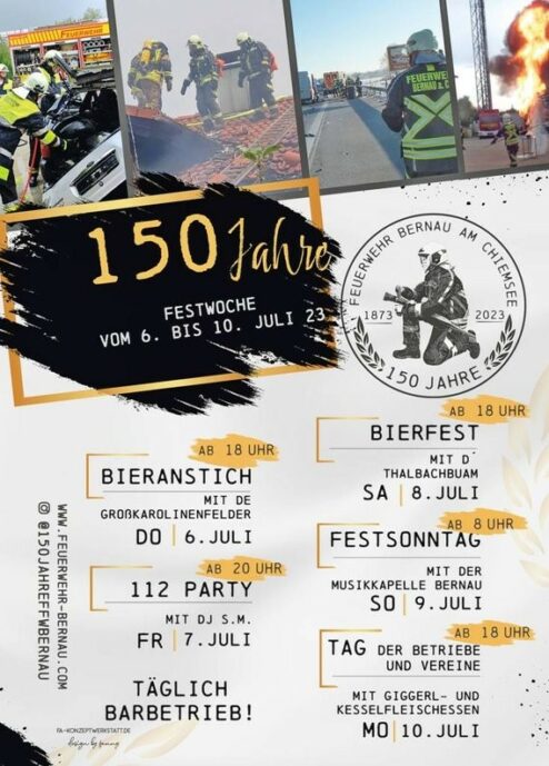 Das 150jährige Bestehen der Feuerwehr in der Gemeinde Bernau a. Chiemsee wird an diesem Wochenende groß gefeiert. So beginnt ein Bierfest am Samstag, 8. Juli um 18 Uhr mit den Thalbach-Buam.
