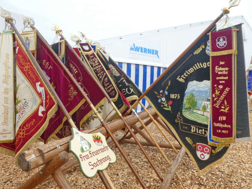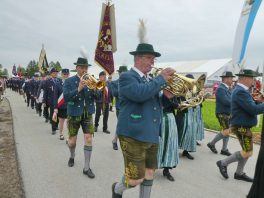 Das Stelldichein der Feuerwehren aus rund 80 Vereinen begann mit einem Kirchenzug vom Festplatz an der Bernauer Straße in den Trautersdorfer Obstgarten. In guter Priener ökumenischer Verbundenheit begann der Fest-Gottesdienst am Feldaltar, mit dem seit dem Priener Glaubensfest vorhandenem großen, dreiwinkligem Kreuz sowie mit der Festmusikkapelle Prien unter der Leitung von Stefan Fußeder. Pfarrer Klaus Hofstetter hielt dabei anschaulich den Gläubigen einen Spiegel vor, nicht um ihnen die Leviten zu lesen, sondern um Ihnen klar zu machen, dass Jeder ein Bild Gottes ist. Dabei erinnerte er daran, dass das auf Herrenchiemsee ausgearbeitete Grundgesetz vor 70 Jahren in Kraft trat und mit dem Satz „Die Würde des Menschen ist unantastbar“ beginnt. „Geben ist seliger denn Nehmen“ – mit diesen Worten begann Pfarrer Karl-Friedrich Wackerbarth seine Betrachtungen und ergänzte dies mit dem Satz: „Selbstlosigkeit ist gut, aber man sollte sich auch um sich selbst kümmern, damit man nicht verkümmere“. Und Bezirksapostel Andreas Sargant fügte hinzu: „Liebe befähigt zu Außergewöhnlichem, Gott ist Liebe in reinster Form und mit Gott kann man auch durchs Feuer gehen“. Im Rahmen des Festgottesdienstes erhielten die aus dem Jahr 1871 stammende und wieder restaurierte Fahne sowie das neue Hilfeleistungs-Löschfahrzeug HLF 20 ihren kirchlichen Segen. Die Kollekte kommt jeweils zur Hälfte dem Ökumenischen Sozialdienst in Prien und einer Partner-Aktion im afrikanischen Tansania zugute.