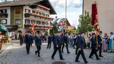 Alle Feuerwehrmänner und -frauen der Samerberger Feuerwehren (Törwang, Grainbach, Roßholzen und Steinkirchen) mit den 3 Bürgermeistern vom Samerberg (1. Bürgermeister Georg Huber, 2. Bürgermeister Christoph Heibler, 3. Bürgermeisterin Christine Eckert), sowie den Tafelträgern und Vereinsfahnen.