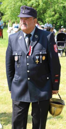 Warten auf die Umrathshauser Spritze: Altkommandant Scheck mit dem historischen Helm