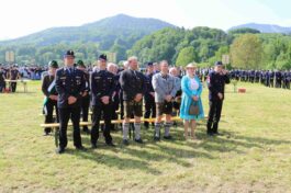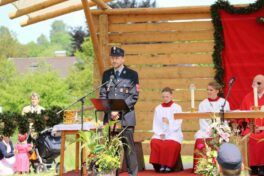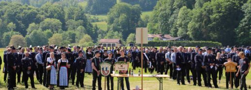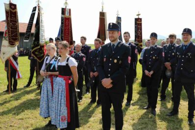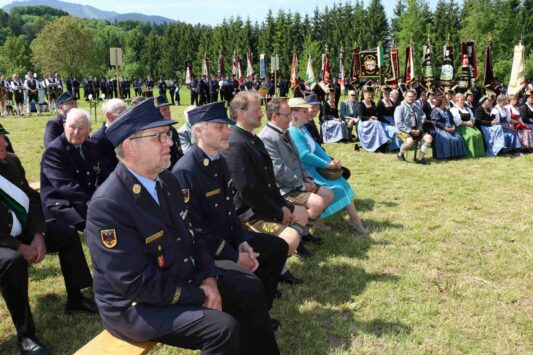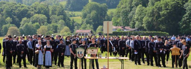 38 Fahnen der Feuerwehren aus der Region und der Ortsvereine standen rund um den Feldaltar auf der Südseite von Frasdorf, um den Festgottesdienst gemeinsam mit Pfarrer Overmeyer zu feiern. „Euer Motto ist keine leere Phrase, ihr erfüllt es seit 150 Jahren mit Leben und seid für eure Nächsten da, auch unter Einsatz des eigenen Lebens“. Musikalisch umrahmten die Musikkapelle Wildenwart unter der Stabführung von Wolfgang Kink und die Frasdorfer Singgemeinschaft unter der Leitung von Bernadette Osterhammer den Festgottesdienst mit der Ölbergmesse von Sebastian Weyerer.