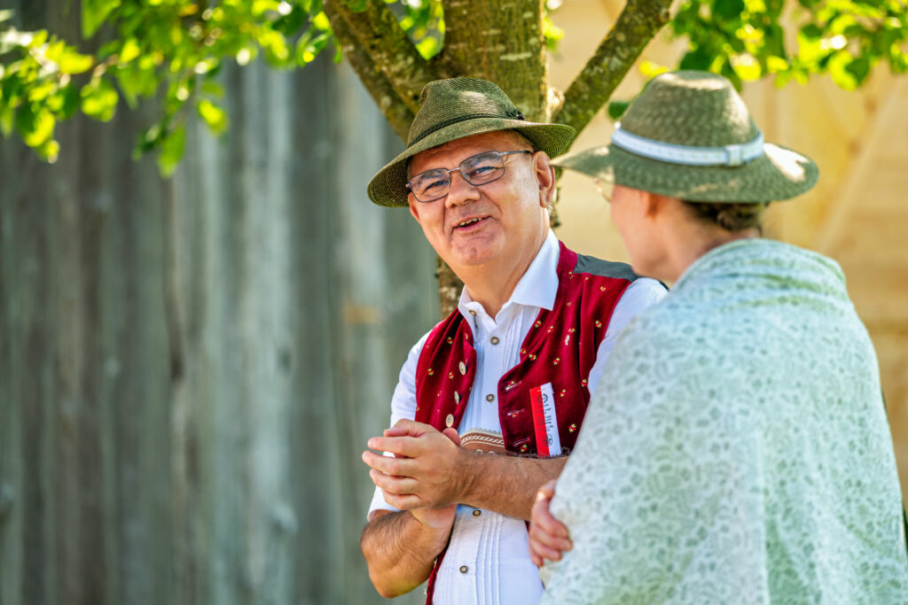 Diakon Günter Schmitzberger mit seiner Frau applaudieren beim Festzug in Moosen