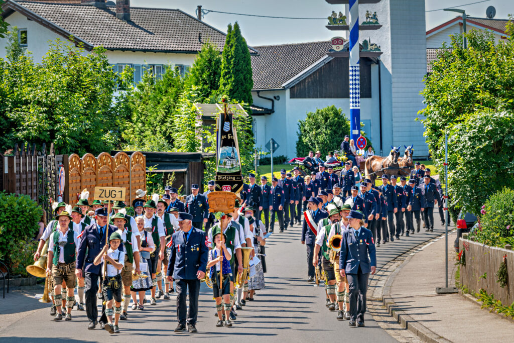 Am Sonntag starteten die Jubiläumsfeierlichkeiten der Freiwilligen Feuerwehr Pietzing mit einem festlichen Kirchenzug vom Festzelt hinauf zum malerisch gelegenen Kirchplatz vor Moosen am Simssee. Bei strahlendem Sonnenschein zogen Feuerwehrleute in Uniform, Musikkapellen und Fahnenabordnungen begleitet von traditioneller Blasmusik durch den Ort.