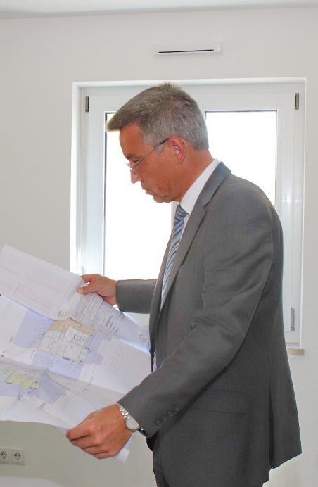 Landrat Otto Lederer bei der Besichtigung einer der neuen Wohnungen vertieft in den Grundriss des Gebäudes