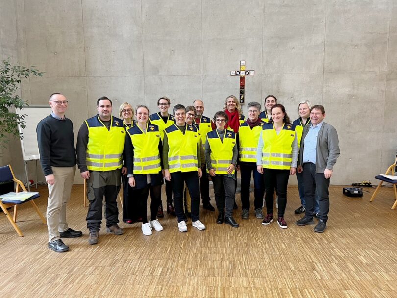 Bildunterschrift: Zum Dienst in die bayerischen Dekanate wurden entsandt: (ab 2. v. li.) Maximilian Neu (Dekanat Kitzingen), Christine Kiok (München), Natascha Becker (Aschaffenburg), Eva Stängle (Kitzingen), Dr. Susanne Pauser (Bamberg), Marion Langfritz (Nürnberg), Reinhold Lösel (Ansbach), Ulrike Bilz (Nürnberg), Rosi Behmer (Landshut), Claudia Grunwald (Würzburg), Mona Hüser (Kitzingen), Sabine Heumüller (Kitzingen), Susann Prenzler (Fürth). Nicht auf dem Foto: Angela Wagner (Michelau), Elke Weber-Rubenbauer (Coburg) und Michaela Schumann (Freising). Flankiert werden die ehrenamtlichen Notfallseelsorger:innen von (li.) Dirk Wollenweber (landeskirchlicher Beauftragter für die Notfallseelsorge und Seelsorge in Feuerwehr und Rettungsdienst) sowie (re.) Christian Krause (Referent für die Aus- und Fortbildung in der Notfallseelsorge). Das Bild entstand beim Entsendungsgottesdienst in der Kirche St. Paul in Fürth.